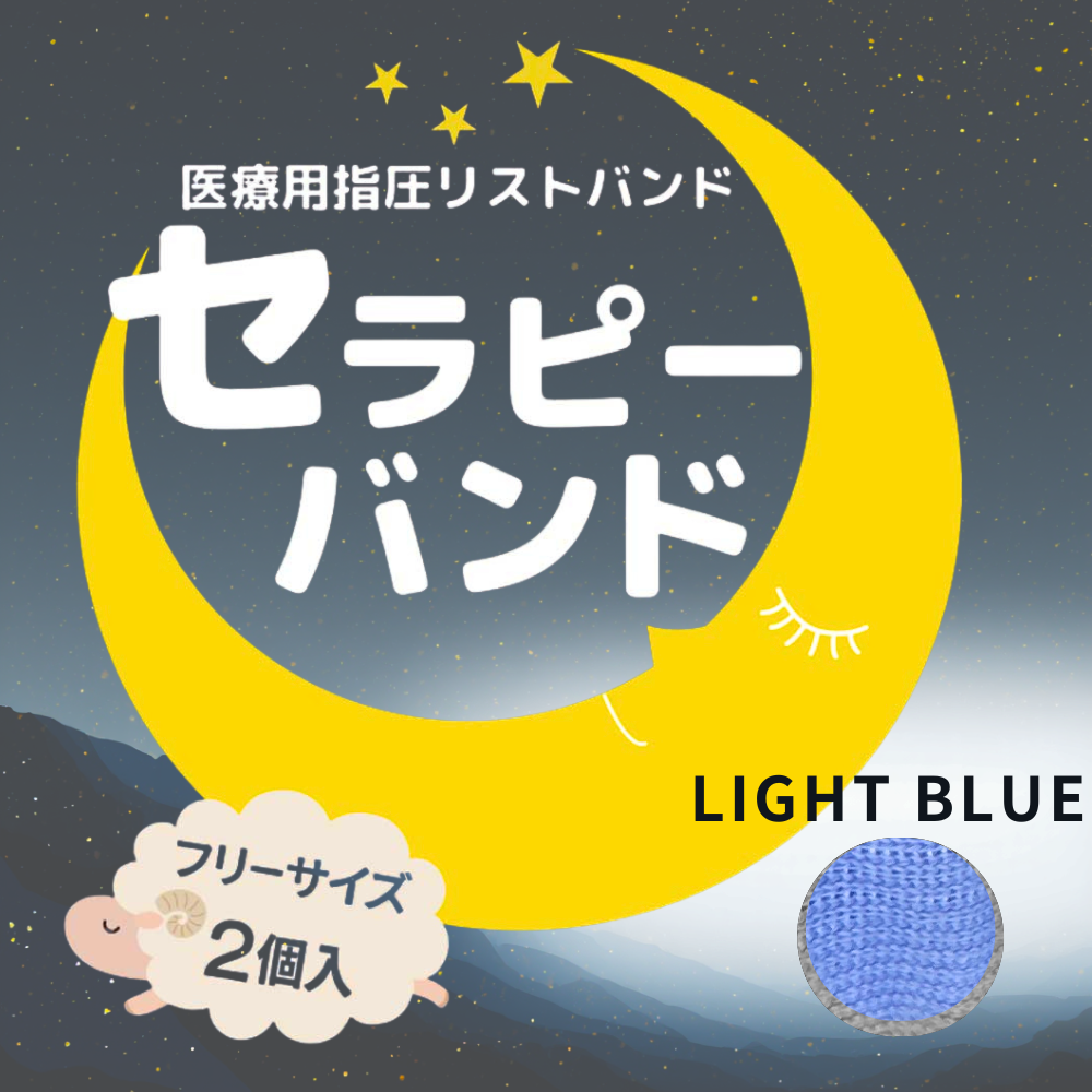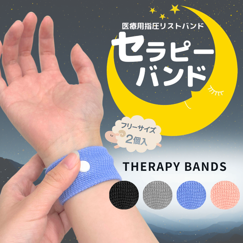 セラピーバンドは、睡眠の質を向上させるための医療用指圧リストバンドです。手首にある「神門」「内関」「大陵」などのツボを簡単に指圧でき、リラックス効果が期待できます。一般医療機器として、非侵襲式の家庭向け鍼用器具として安心して使用可能。ストレス軽減や不眠解消に役立ち、快適な眠りをサポートします。ピンク、ブルー、ブラックの3色展開で、日常生活に取り入れやすいデザインです。