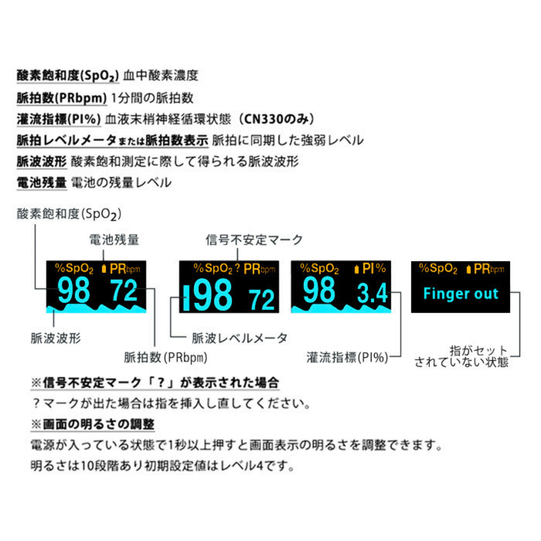 ・ 測定信号が不安定な場合にはクエスチョンマーク(?)を表示します。指先を動かさすに再測定してください。